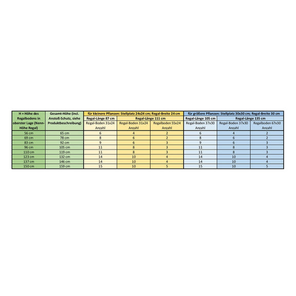 Die Anzahl der Böden, die im Lieferumfang enthalten sind, ist daran orientiert, dass Sie Etagenhöhen erhalten, die zu den gewöhnlichen Höhen von üblicher Weise in Regale gestellte Pflanzen passen – siehe Tabelle in der Galerie (letztes Bild).