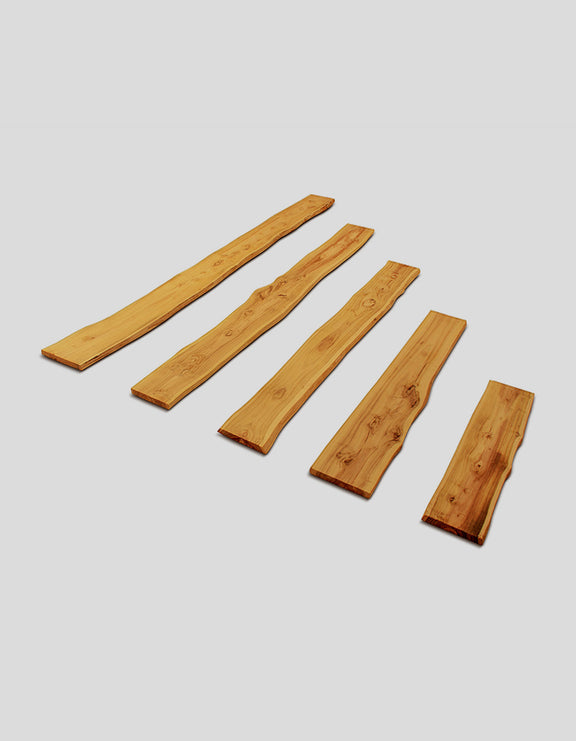 Die Bretter sind von gerade gewachsenen Stämmen gesägt und anschließend gehobelt. Durch das Hobeln wird eine ebene Brett-Oberfläche hergestellt. Rauheiten an eingewachsenen Ästen oder anderen Stellen mit abweichender Holzstruktur sind jedoch nicht immer zu vermeiden. Da die Bretter nicht seitlich begradigt (besäumt) sind, weisen sie die naturgewachsene Form des Stammes auf. Die Schmalseiten der Bretter werden von Rinde und Bast befreit; Unebenheiten werden geglättet. Schließlich werden die Schmalseiten geschliffen. Da die Brettbreite naturgegeben variiert, ist hierfür ein Von-bis-Maß angegeben. Im Brett sieht man das Wuchsbild des Stammes, auch eingewachsene Äste.