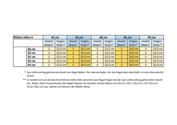 Die im Lieferumfang enthaltene Anzahl der Böden ist so gewählt, dass bei weitgehend gleichmäßiger Anordnung der Böden die Etagenhöhe der Regaltiefe nahekommt. Teilweise ist sie etwas darüber, teilweise etwas darunter. Dem liegt die Überlegung zugrunde, dass tiefere Regale für größere Gegenstände gewählt werden, die tendenziell auch eine größere Etagenhöhe benötigen. Somit sollten Sie genügend Böden bekommen, ohne dass Böden übrigbleiben. Die Anzahl der zum Lieferumfang gehörenden Böden sowie die sich daraus ergebende durchschnittliche Etagenhöhe, abhängig von Regalhöhe und -tiefe, möchten Sie bitte der Tabelle in der Galerie entnehmen (letztes Bild).